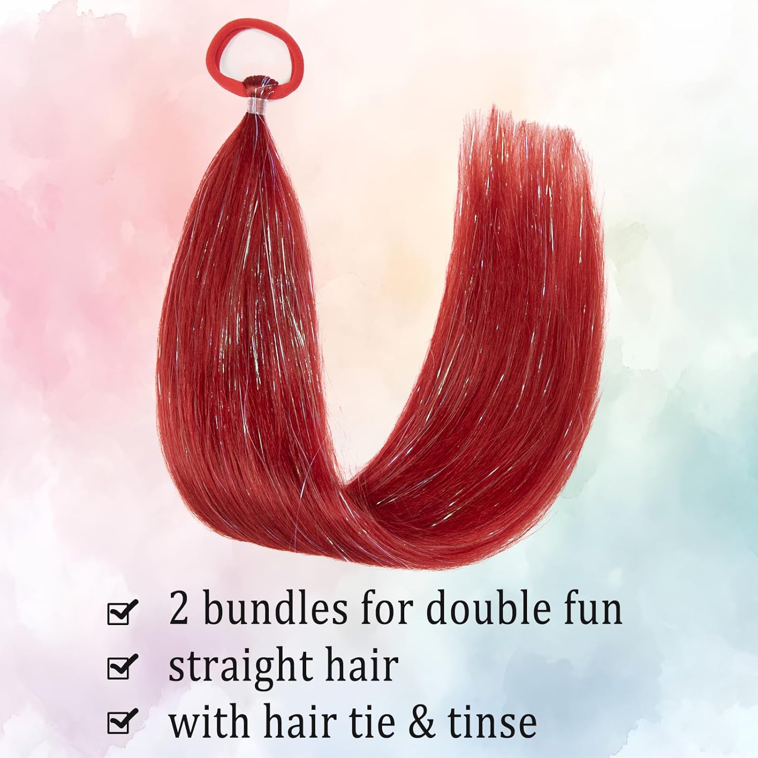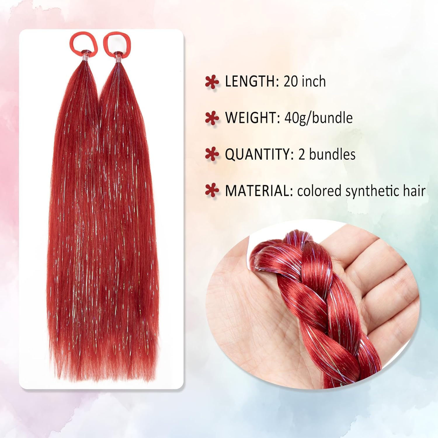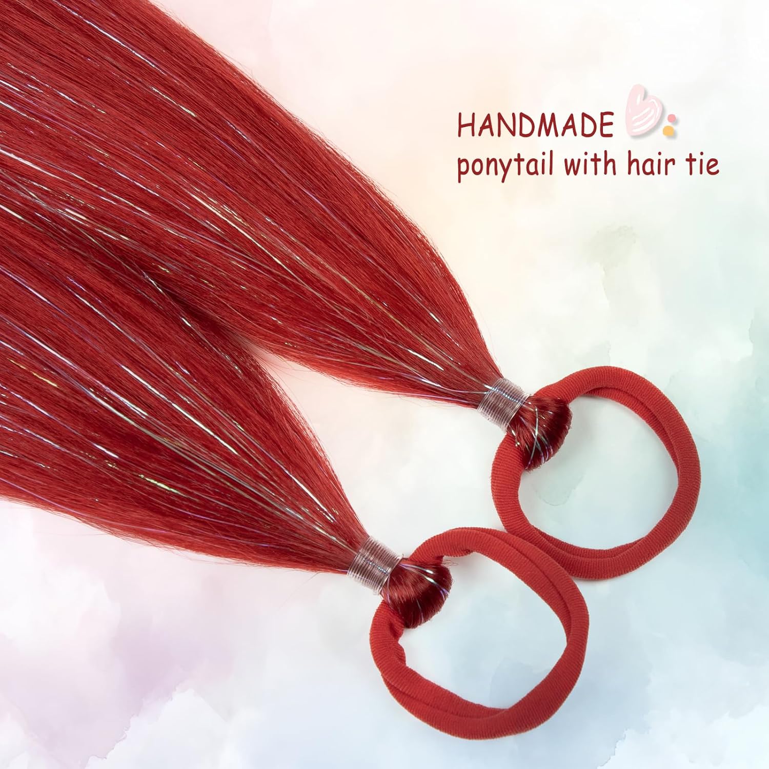 Colored Hair Extensions Red Ponytail Extension 2 Packs, 20 inch Crazy Hair Day Accessories for Women, DIY Festival Wacky Rave Braids,Tinsel Mixed (Red)