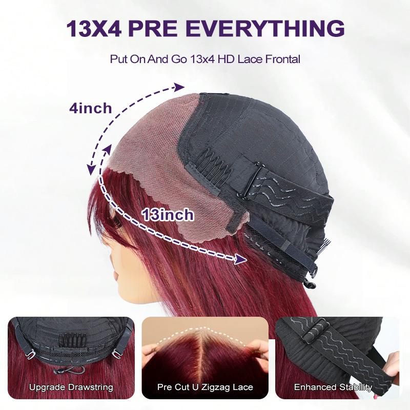 Menglle Hair 99j/highlight 13x4 Long Straight With Bangs Glueless Human Hair Lace Front Wig Burgundy Silky Straight Lace Wig Easy Wear 180% Density Red Wine Color